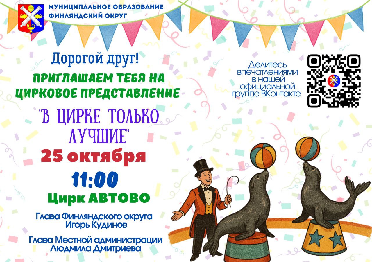 В преддверии осенних каникул Местная администрация Финляндского округа приглашаем вас на цирковое представление «В цирке только лучшие», которое состоится 25 октября в 11:00 по адресу: ул. Автовская, д. 1а (Цирк в Автово). Продолжительность: 2 ч. 30 мин. (с антрактом)
