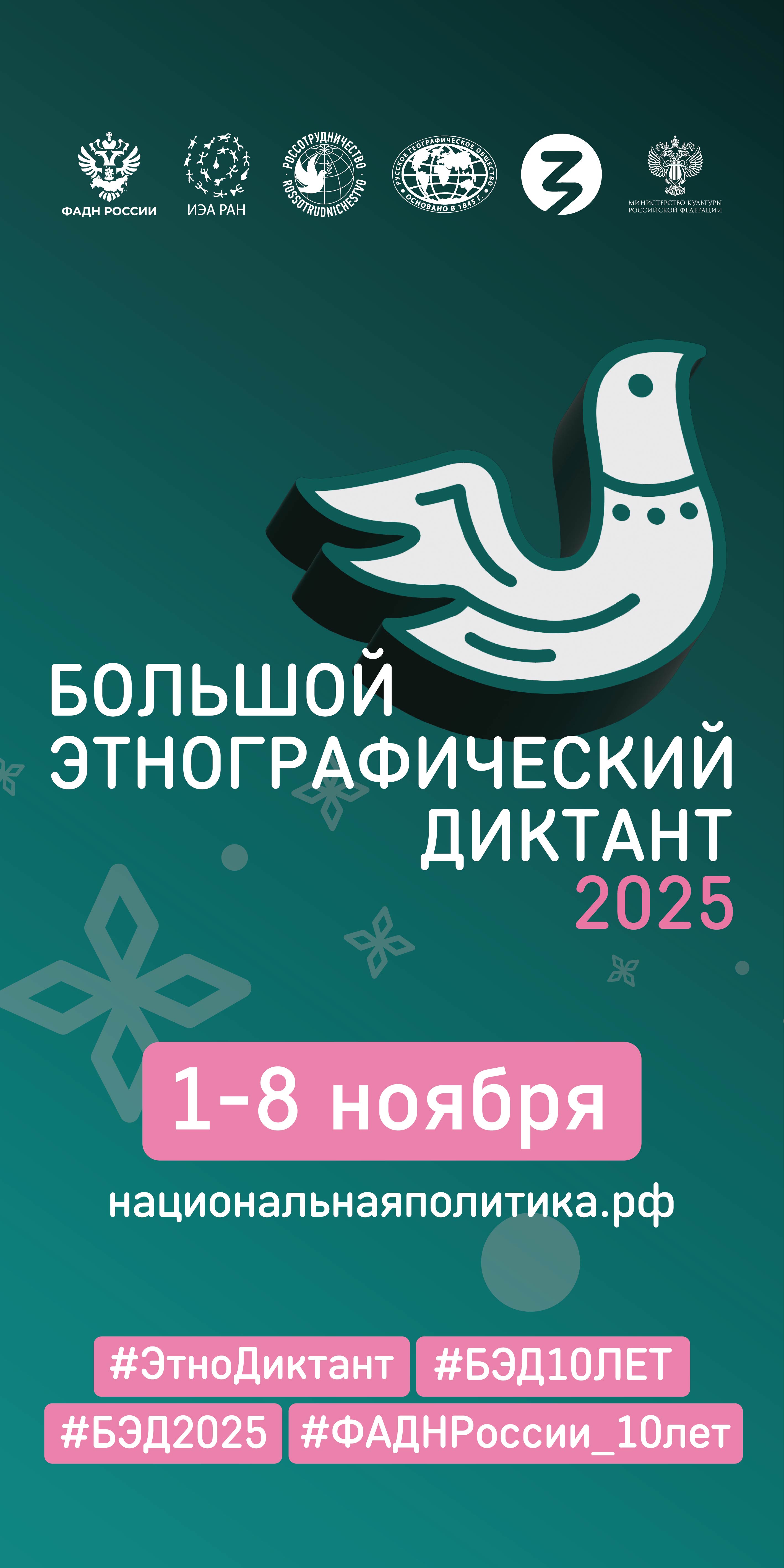 С 1 по 8 ноября 2025 года Федеральное агентство по делам национальностей совместно с партнёрами проводит X Всероссийскую просветительскую акцию «Большой этнографический диктант». Юбилейная, десятая по счёту акция направлена на укрепление общероссийской гражданской идентичности, популяризацию традиционных российских духовно-нравственных ценностей и борьбу с фальсификацией истории.
