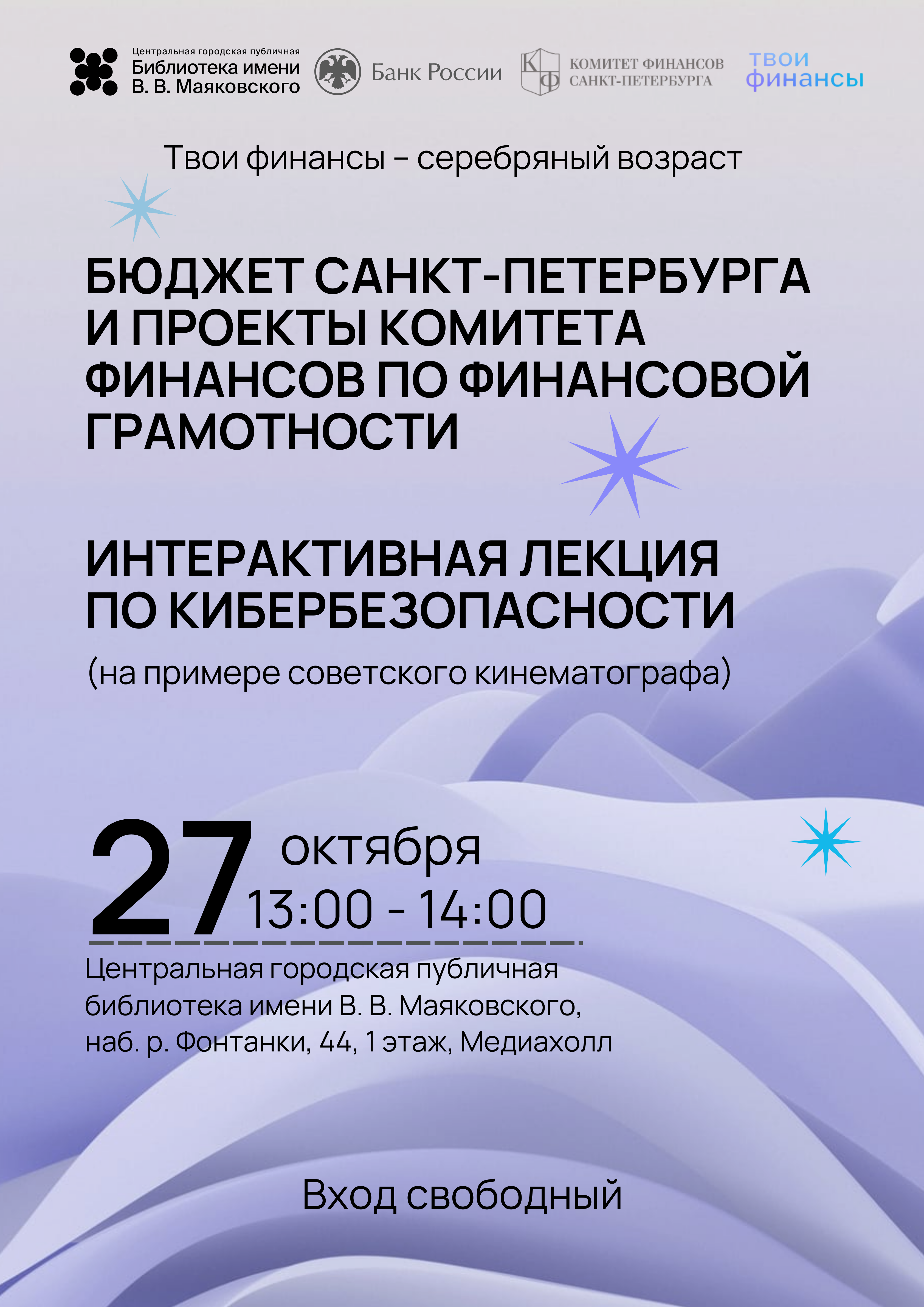 Центральная городская публичная библиотека им. В.В. Маяковского и Комитет финансов Санкт-Петербурга приглашают представителей «серебряного возраста» и всех желающих повысить свой уровень финансовой грамотности на лектории «Твои финансы – серебряный возраст». В рамках мероприятия пройдут лекции специалистов Комитета финансов и Северо-Западного ГУ Банка России.