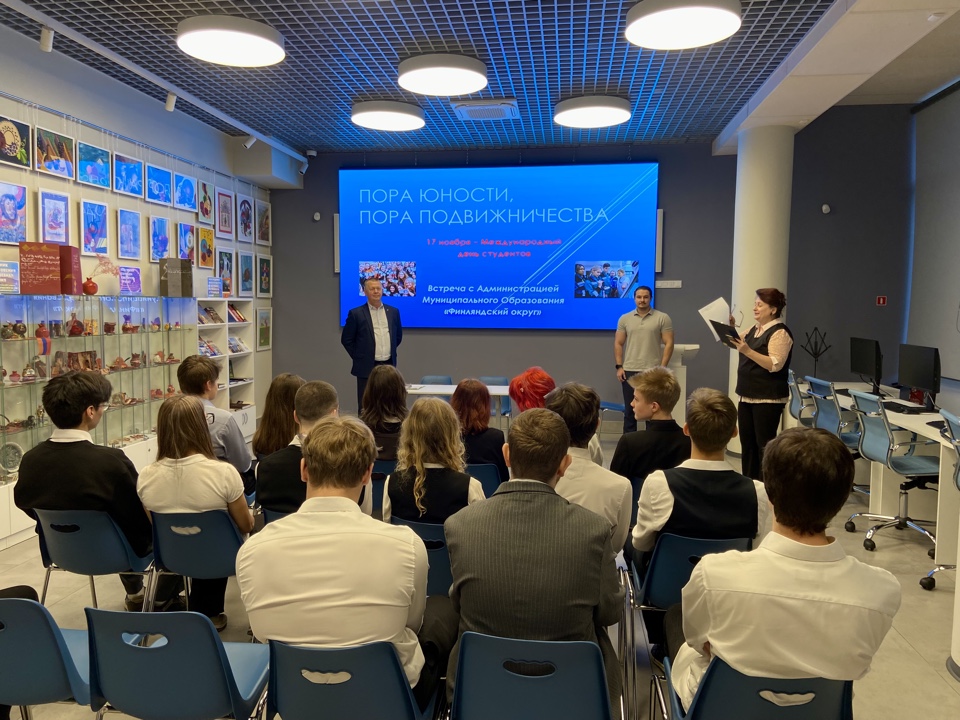 В Международный день студентов заместитель главы Финляндского округа Игорь Шесточенко и председатель Молодежного совета округа Мелик Нагапетян встретилась с учащимися 10 класса школы №139. Мероприятие называлось «Пора юности, пора подвижничества» и проходило в библиотеке-филиале №10. В ходе встречи были обсуждены дальнейшие планы ребят после окончания школы, ребята узнали о деятельности Молодежного совета, его целях и задачах и многое другое. В завершение встречи Игорь Борисович и Мелик Арзуманович пожелали ребятам успехов в учебе, здоровья и поступления в учебное заведение мечты.