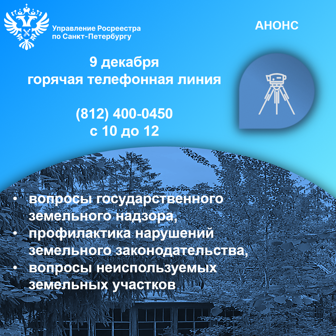 С 10:00 до 12:00 часов 9 декабря 2025 года по телефону: (812) 400-04–50 вам ответит заместитель начальника отдела государственного земельного надзора Константин Геннадьевич Тогулев.