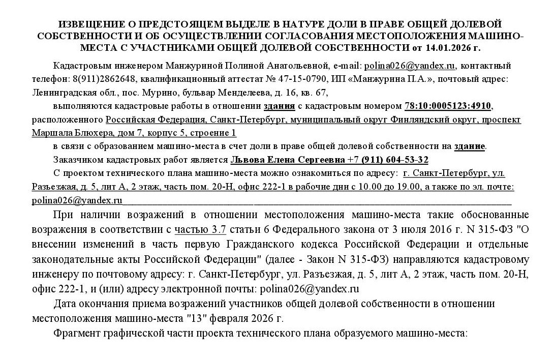 Извещение о предстоящем выделе в натуре доли в праве общей долевой собственности и об осуществлении согласования местоположения машино-места с участниками общей долевой собственности от 14.01.2026 г.