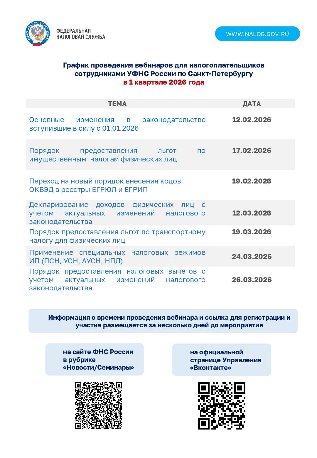 График проведения вебинаров для налогоплательщиков сотрудниками УФНС России по Санкт-Петербургу в 1 квартале 2026 года