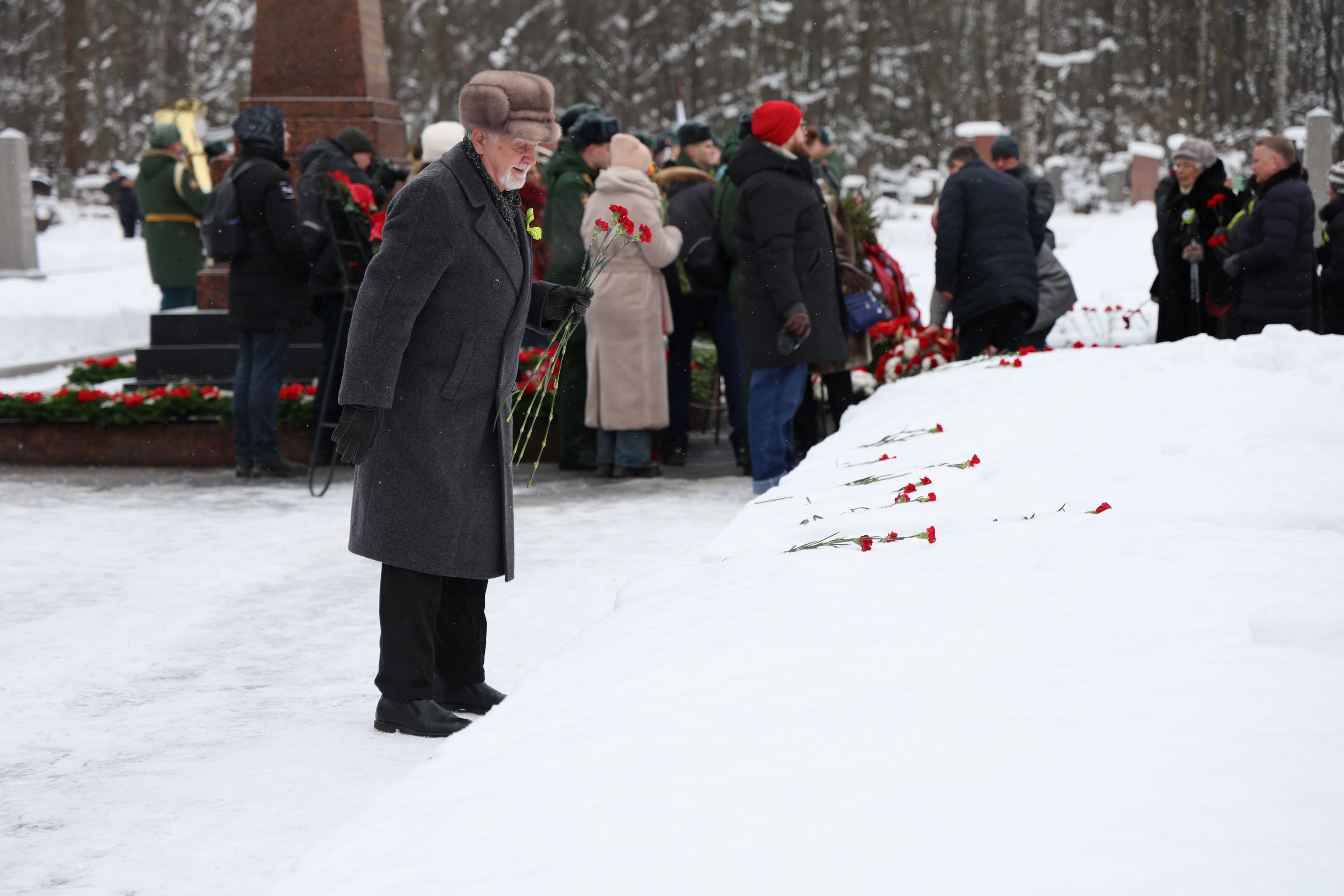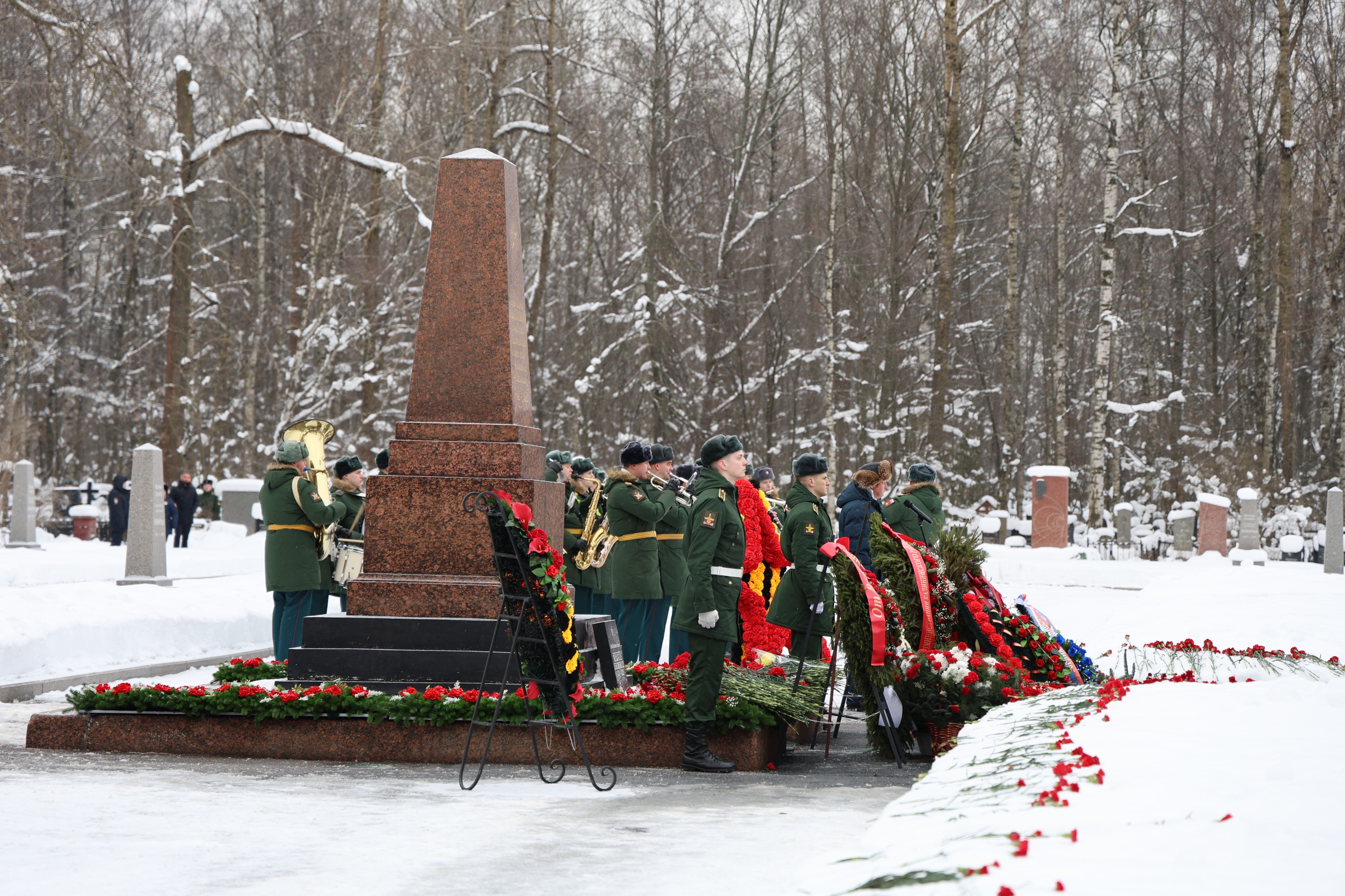 Делегация Финляндского округа сегодня приняла участие в торжественно-траурной церемонии, посвященной 82-й годовщине полного освобождения Ленинграда от фашистской блокады, которая состоялась на Богословском кладбище.