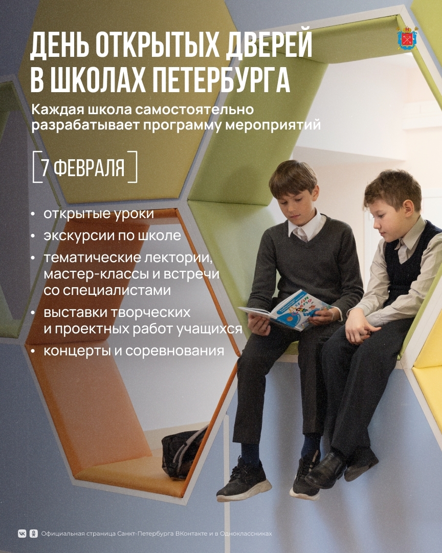 7 февраля с 10:00 до 17:00 в образовательных учреждениях Санкт-Петербурга пройдёт День открытых дверей. Школы приглашают родителей и жителей города познакомиться с образовательной средой, учебными программами и организацией учебного процесса.