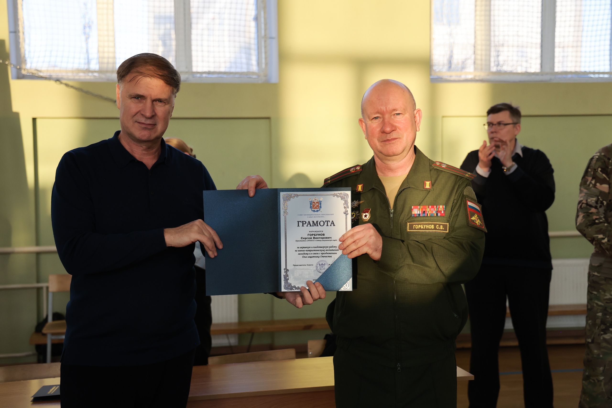 Поздравить ребят и педагогов с наступающим праздником и с участием в «Зарнице» приехал депутат Законодательного Собрания, председатель Совета муниципальных образований Санкт-Петербурга Всеволод Беликов. За активную и плодотворную работу по военно-патриотическому воспитанию молодёжи он вручил грамоты директору Оптико-механического лицея К.В. Костюку, преподавателям ОМЛ С.В. Горбунову и А.В. Трещёву, а также преподавателю Садово-архитектурного колледжа В.П. Малахову и в финале мероприятия подчеркнул, что в подобных конкурсах проигравших быть просто не может, ведь каждый участник - уже победитель, потому что научился быть частью команды, научился дисциплине и чувствовать товарища.
