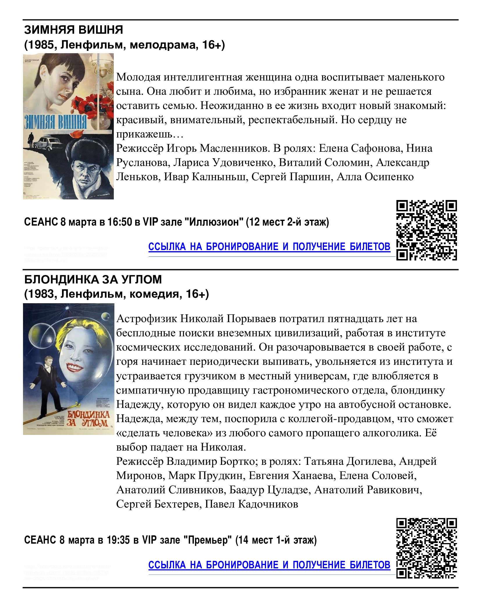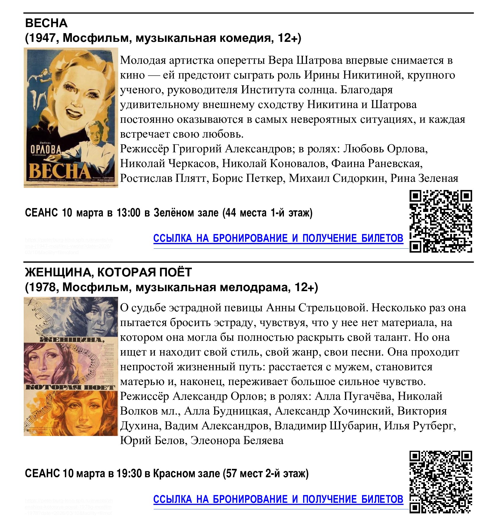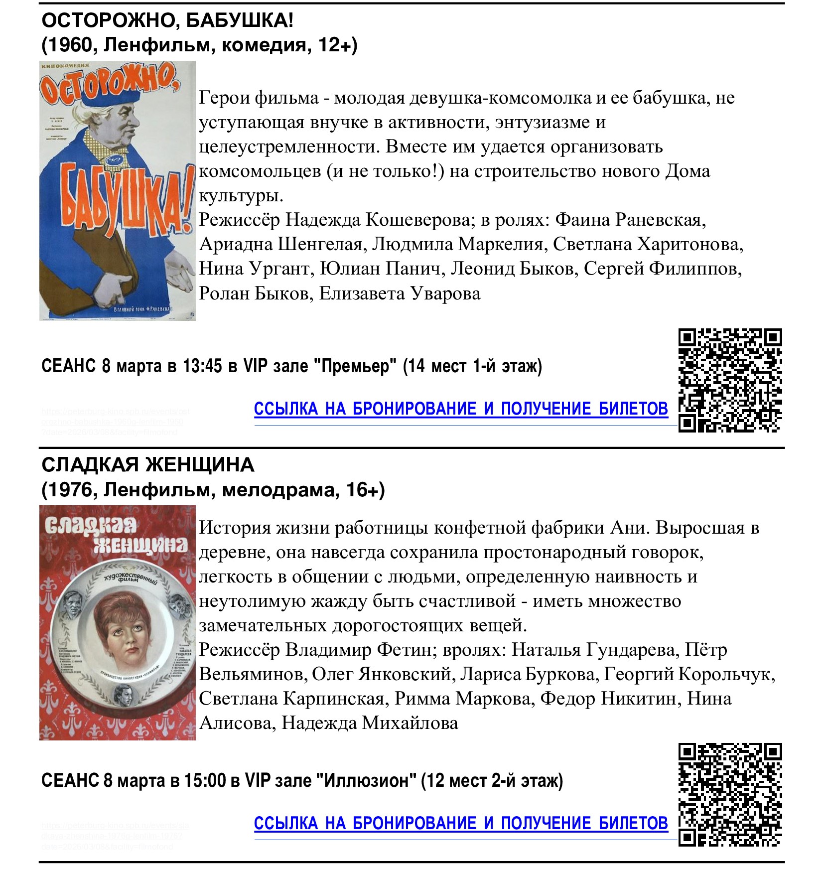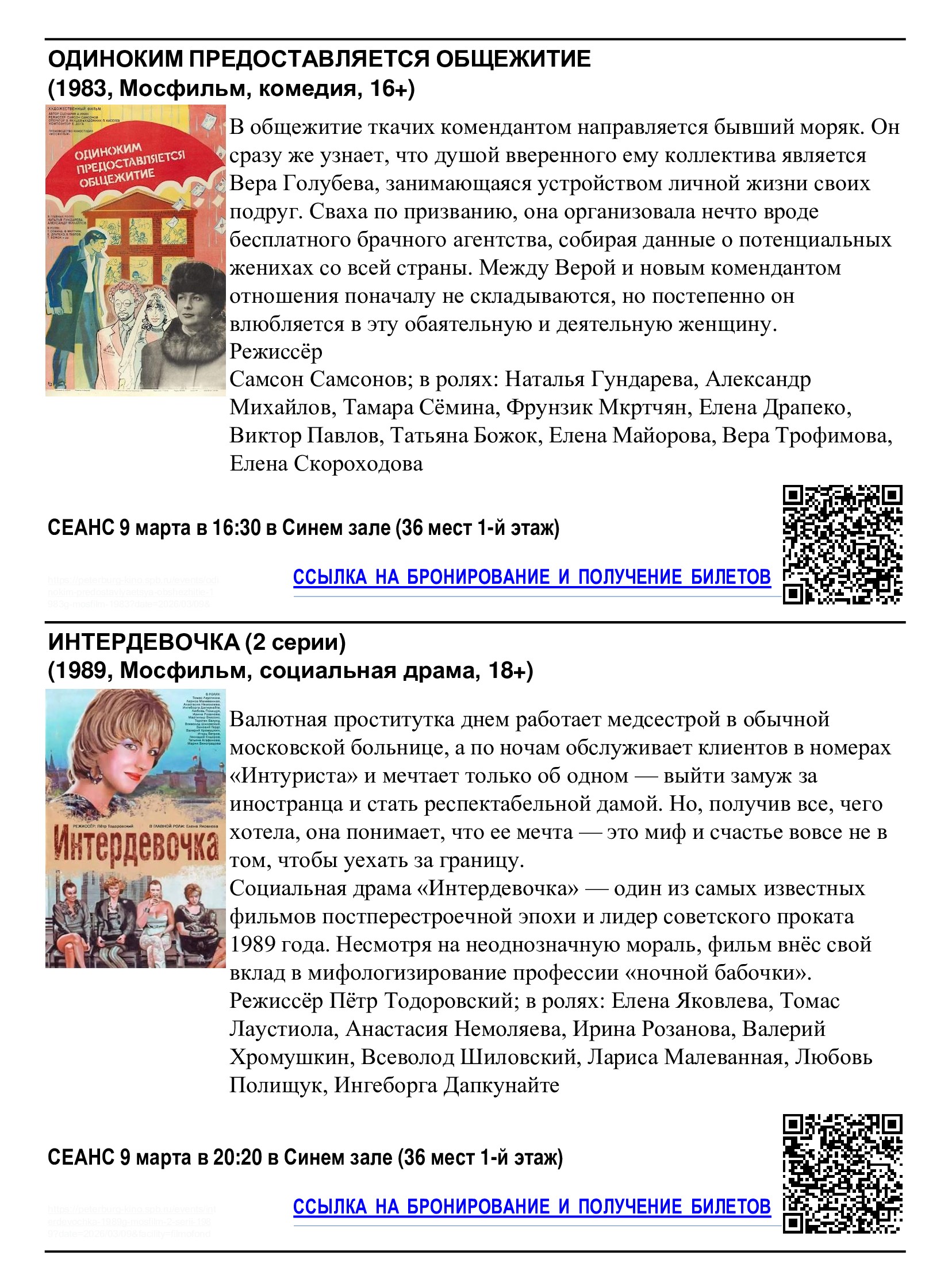 Кинотеатр «Фильмофонд» совместно с Комитетом по культуре Санкт-Петербурга приглашает жителей округа на бесплатные сеансы, посвящённые Международному женскому дню. Бесплатные билеты уже доступны на сайте и в кассе кинотеатра.