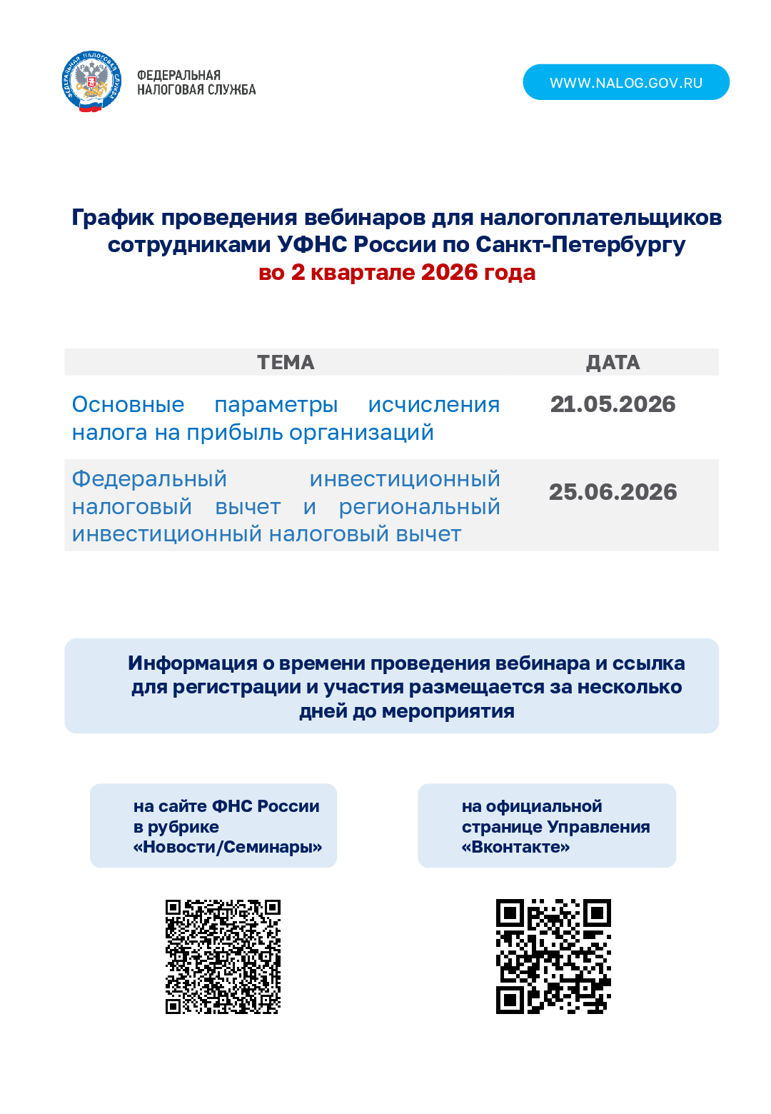 График проведения вебинаров для налогоплательщиков сотрудниками УФНС России по Санкт-Петербургу во 2 квартале 2026 года