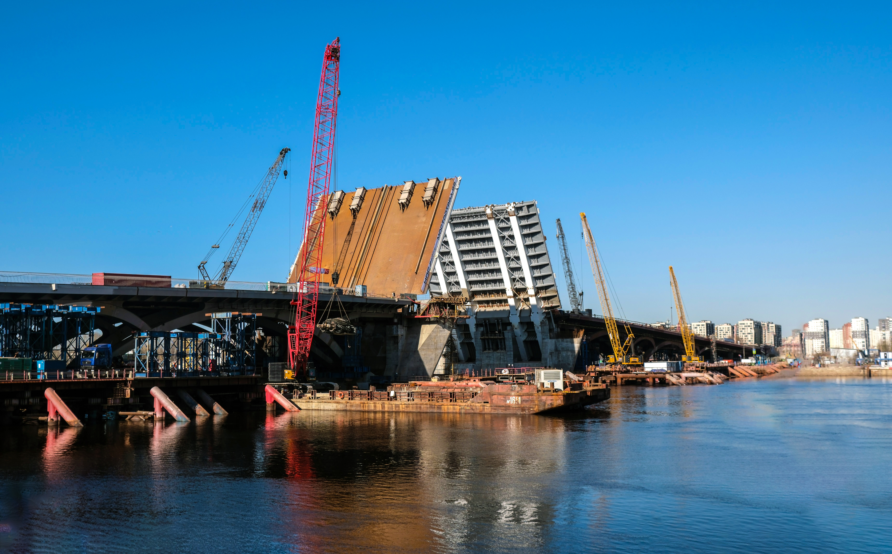 «Работа с пролётами моста требует ювелирной точности. Чтобы мост смог поднять свои «крылья», строители выполнили большой объём работ: установили 8 гидроцилиндров и все элементы противовесной системы, смонтировали двукрылый разводной пролёт и все основные металлоконструкции. Это серьёзный прогресс в строительстве новой, важной для города переправы»,— сказал Александр Беглов.