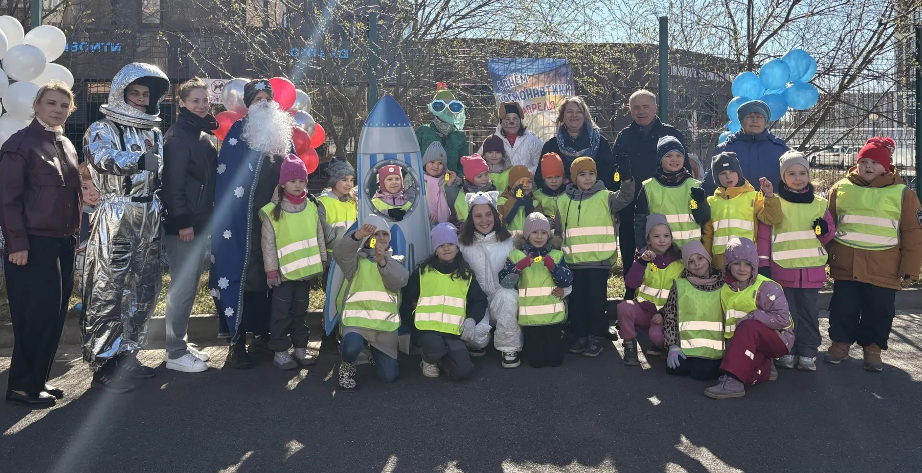 Главными участниками праздника стали воспитанники детского сада №87 и маленькие жители соседних домов. По сценарию ребята разбились на три группы и вместе с ведущими - Звездочётом, Космонавтом и Инопланетянкой выполняли задания по станциям. В конце состязаний каждого участника ждал небольшой, но очень нужный подарок — световозвращающий брелок в виде ракеты. Он сделает их заметнее в тёмное время суток и убережёт от наезда автомобиля.