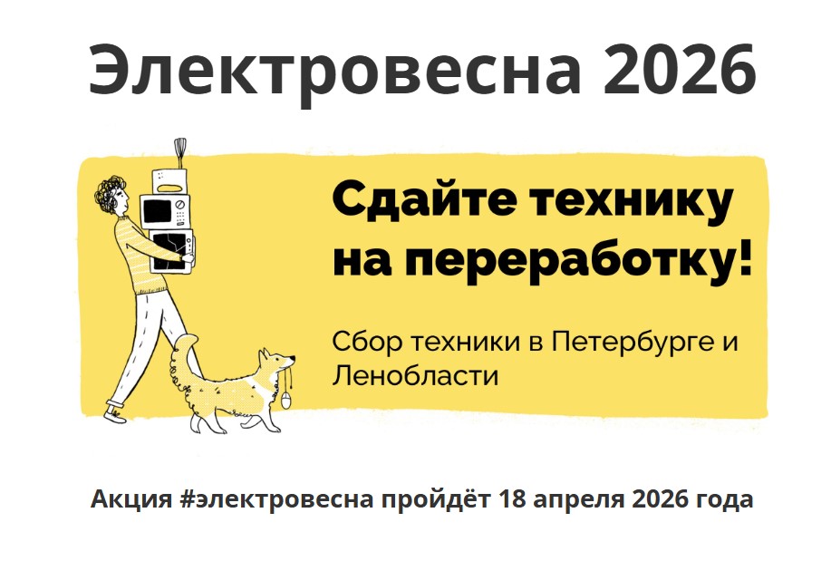 Каждую осень и весну проходит акция по сбору техники в переработку. Приборы нельзя выбрасывать на свалку: в них содержатся опасные вещества и полезные материалы. Волонтёры принимают у жителей Петербурга разбитые телефоны, ненужные провода, древние микроволновки и другие сломанные гаджеты и отправляют их на перерабатывающие заводы. Там опасные компоненты обезвредят, а полезным дадут вторую жизнь.